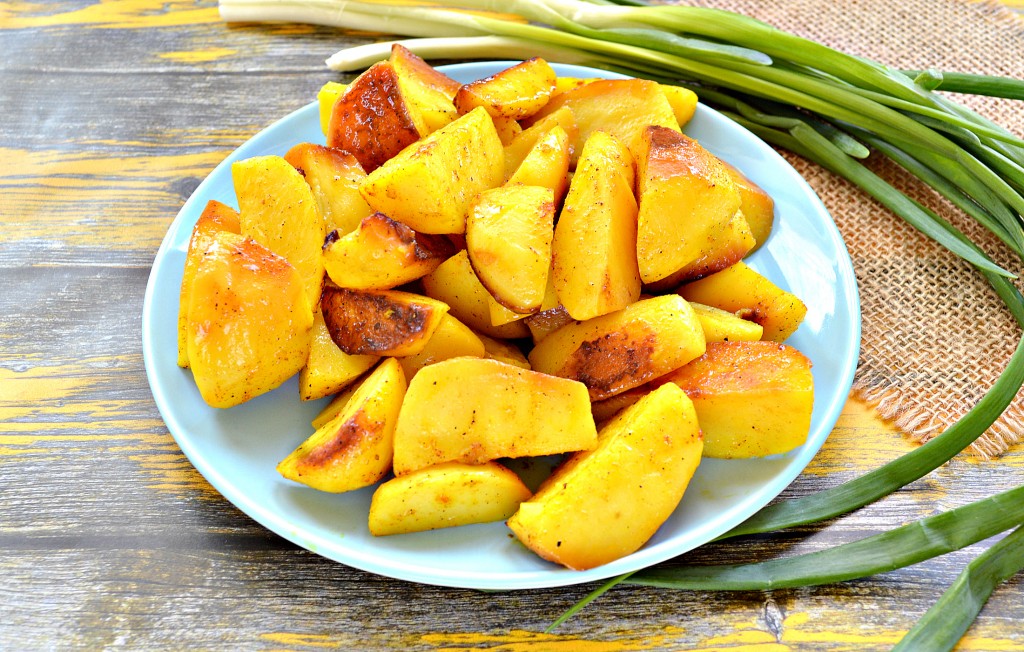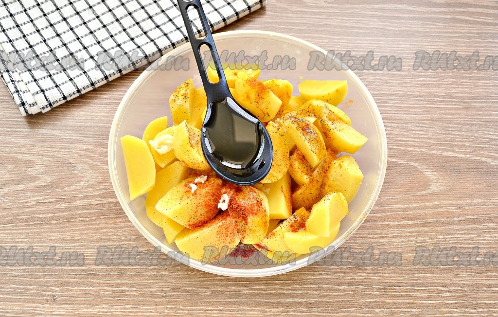 Тщательно перемешать картофельные дольки со специями и маслом.
