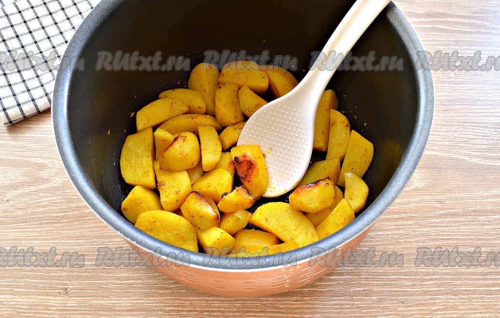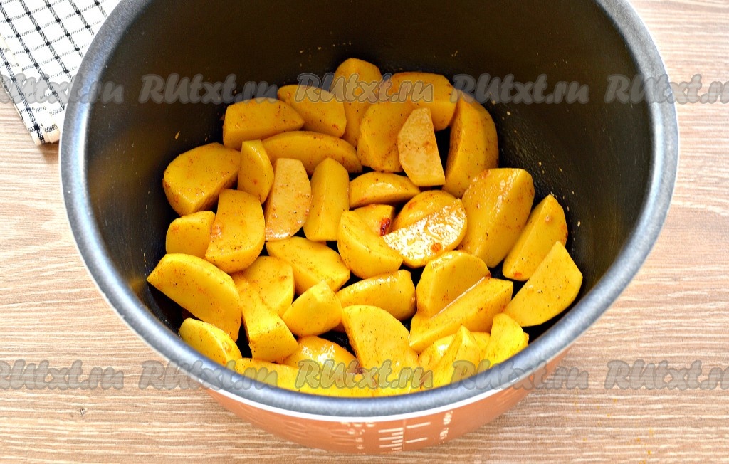 Картошку, смешанную с маслом и специями, переложить в съёмную чашу мультиварки.