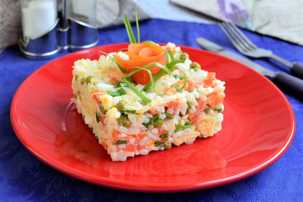 Салат, приготовленный с рисом, сыром, морковью, яйцами и горошком, выложить в салатник или на тарелку с помощью кулинарного кольца или формочки, затем украсить и подать к столу. Это блюдо готовится из вполне доступного набора ингредиентов, а получается аппетитным, сытным и очень вкусным, попробуйте!