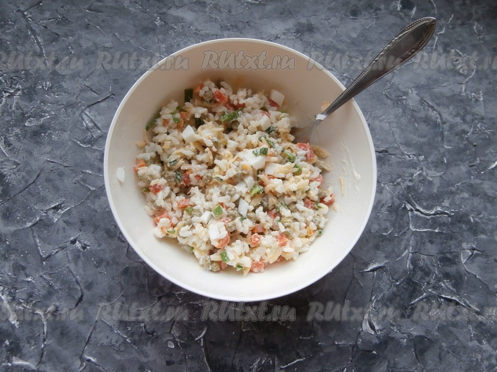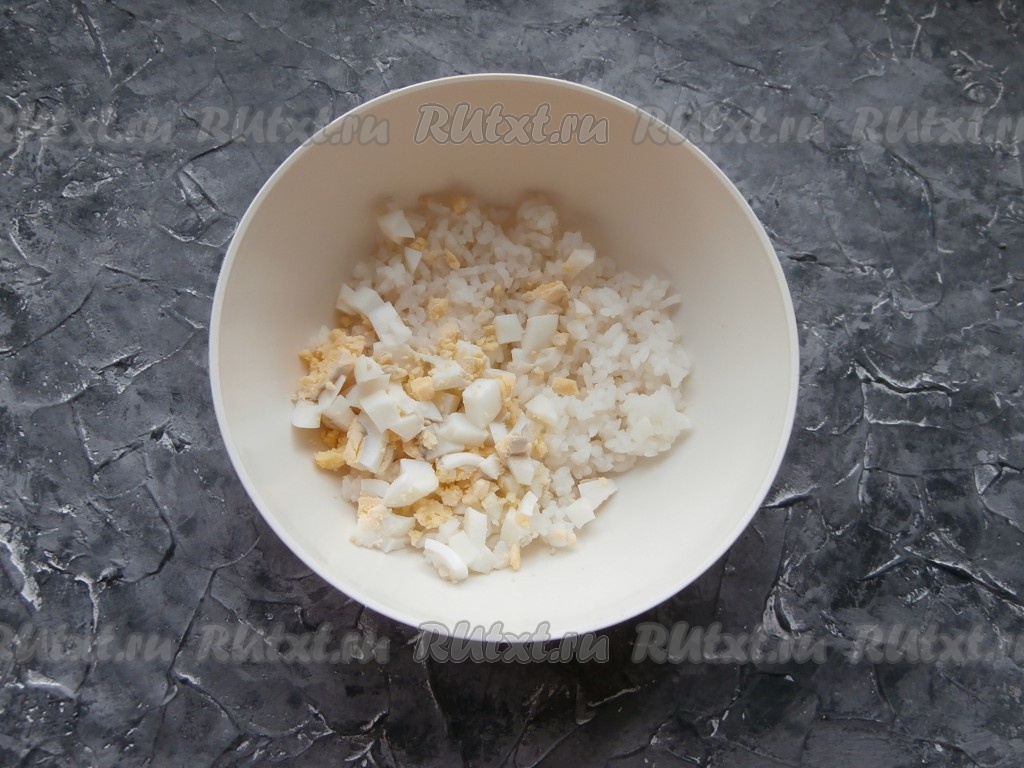 Яйца сварить заранее (варить после закипания воды минут 8-10), затем переложить в холодную воду, чтобы яйца остыли, а после этого очистить. В глубокую миску выложить варёный рис, добавить рубленные варёные яйца.