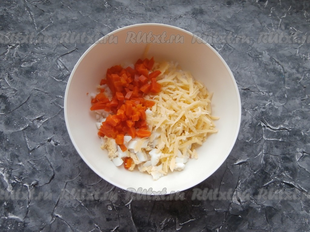 Добавить сюда же нарезанную кубиками варёную морковь и натёртый на крупной тёрке сыр.