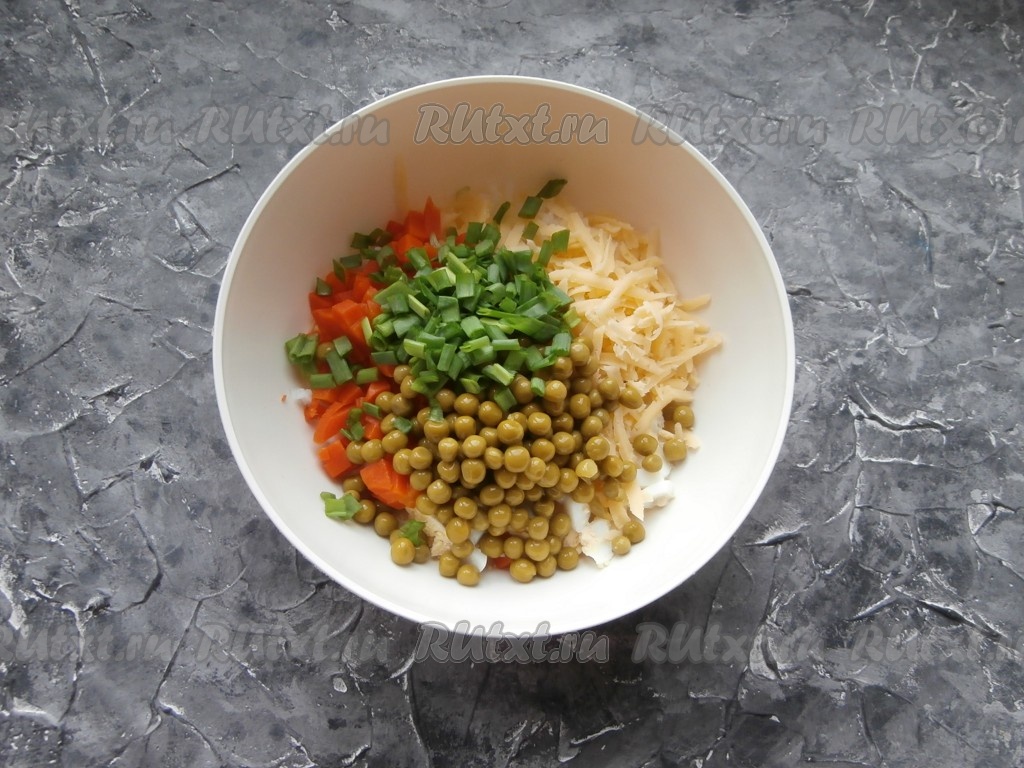 Далее в салат из отварного риса, сыра, моркови и яиц добавить консервированный зелёный горошек и измельчённый зелёный лук.