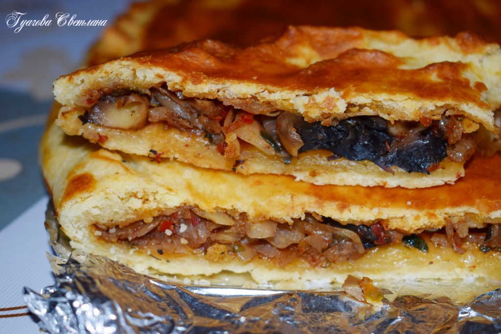 Готовый румяный и ароматный постный пирог с начинкой из капусты и грибов достаём из духовки.
