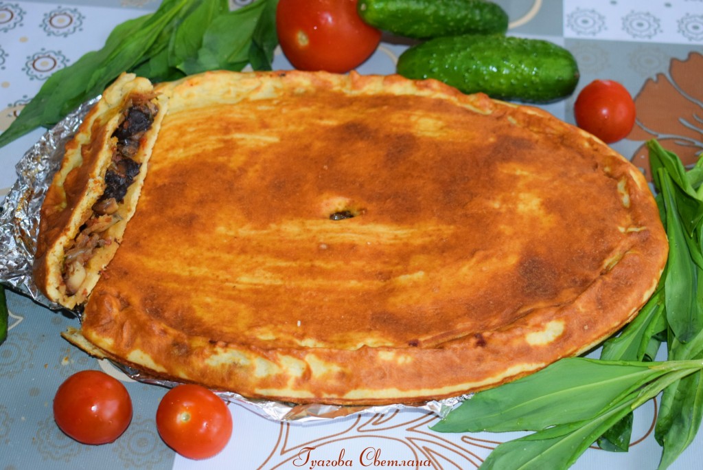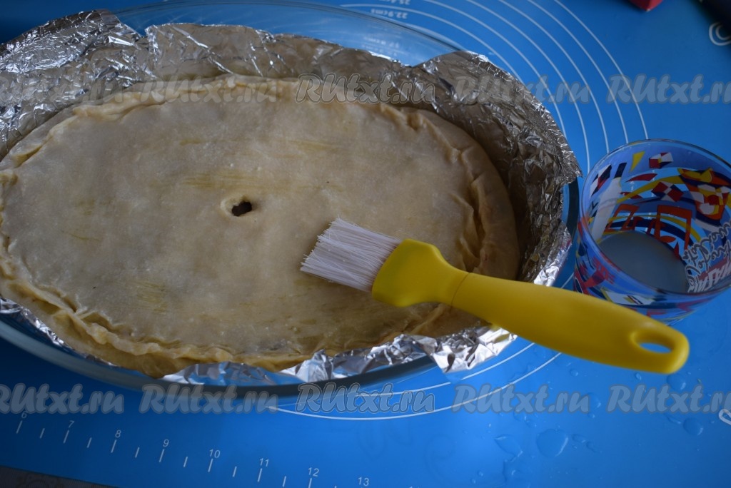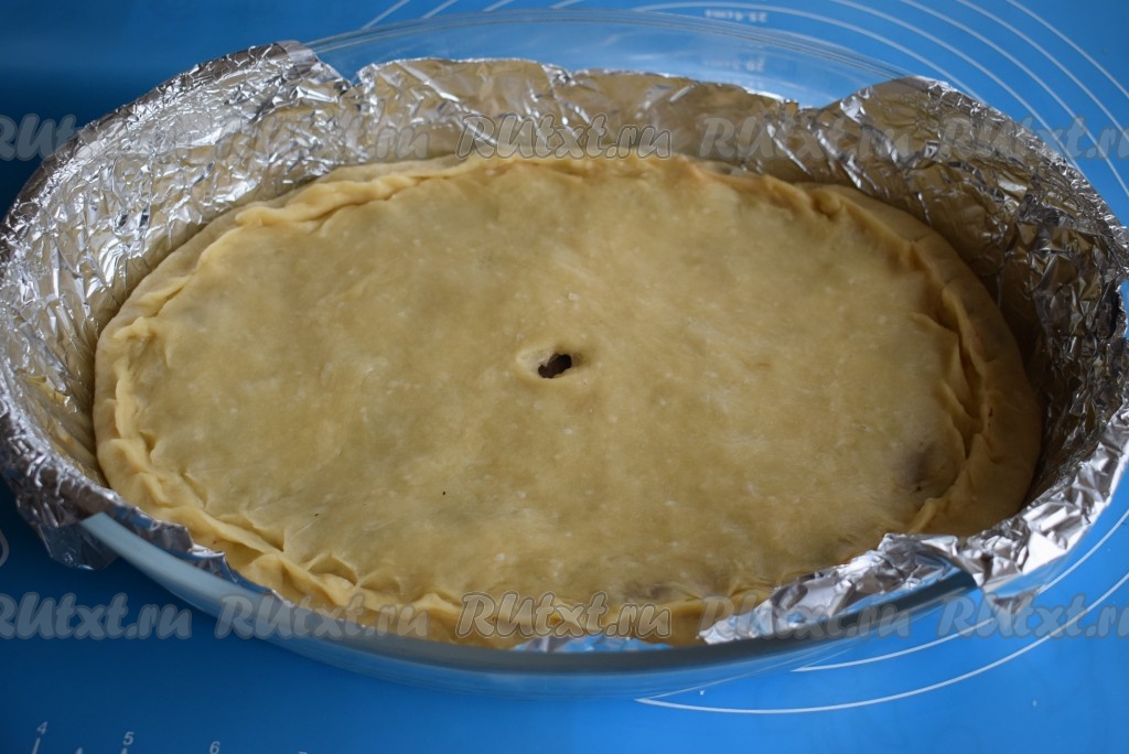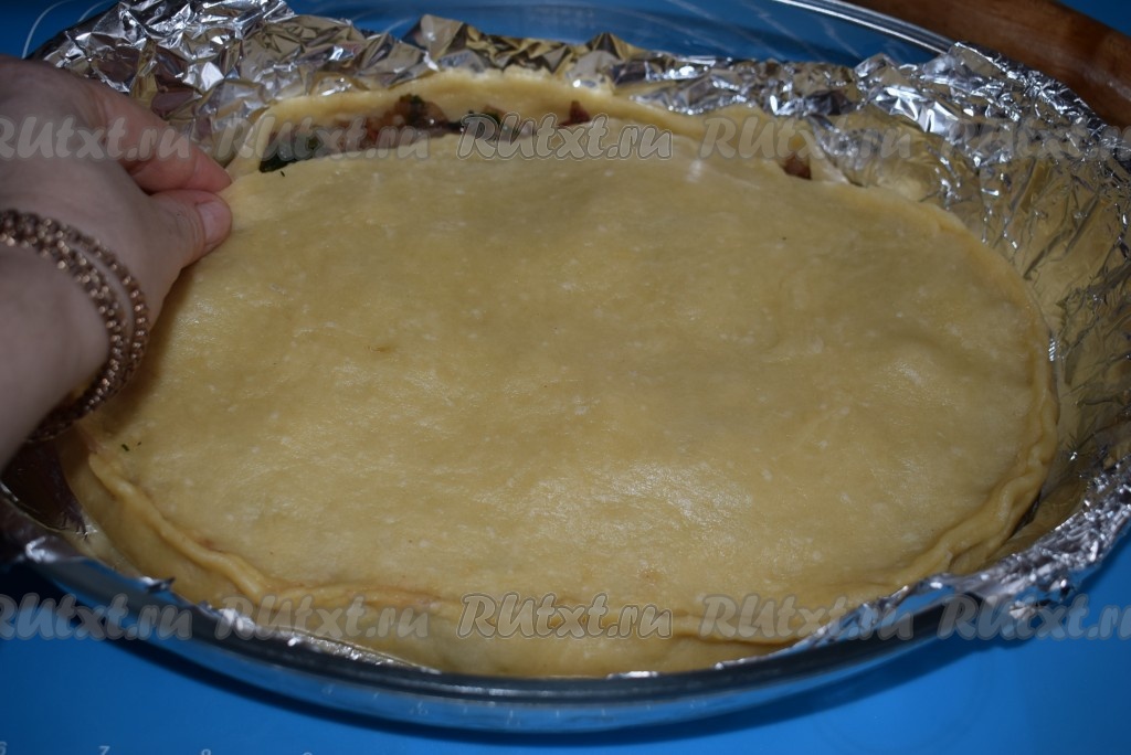 Далее, также при помощи скалки, переносим меньшую раскатанную часть теста, накрывая ею начинку. Пальцами скрепляем обе части теста, формируя закрытый пирог.