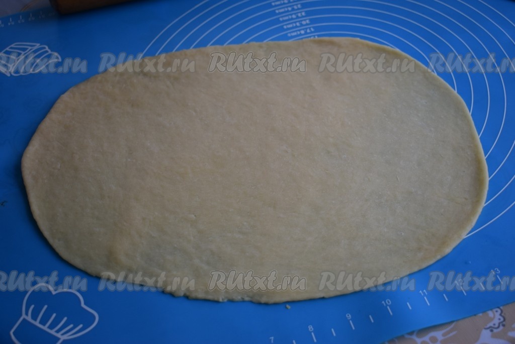 Раскатываем обе части теста на припылённой мукой поверхности в пласты толщиной, примерно, 3 мм.