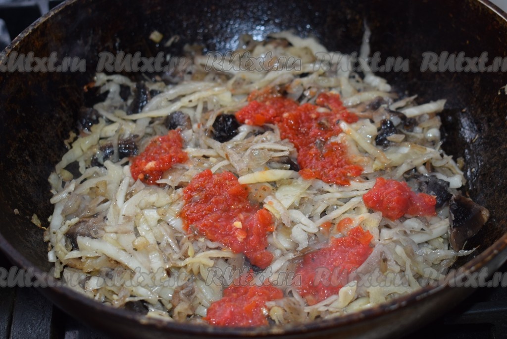 Как только капуста станет мягкой и уменьшится в размерах, добавляем томатную пасту, разведённую 3 столовыми ложками воды (или домашний томат), перемешиваем.