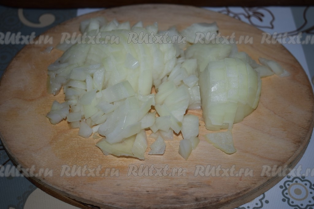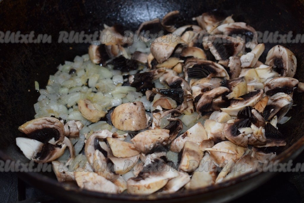 В сковороде разогреем растительное масло, выложим в сковороду измельчённый лук и обжарим его на среднем огне, помешивая, до прозрачности. Затем добавим нарезанные шампиньоны и обжарим грибы с луком в течение 8-9 минут. Посолим, поперчим, добавим специи по вкусу.