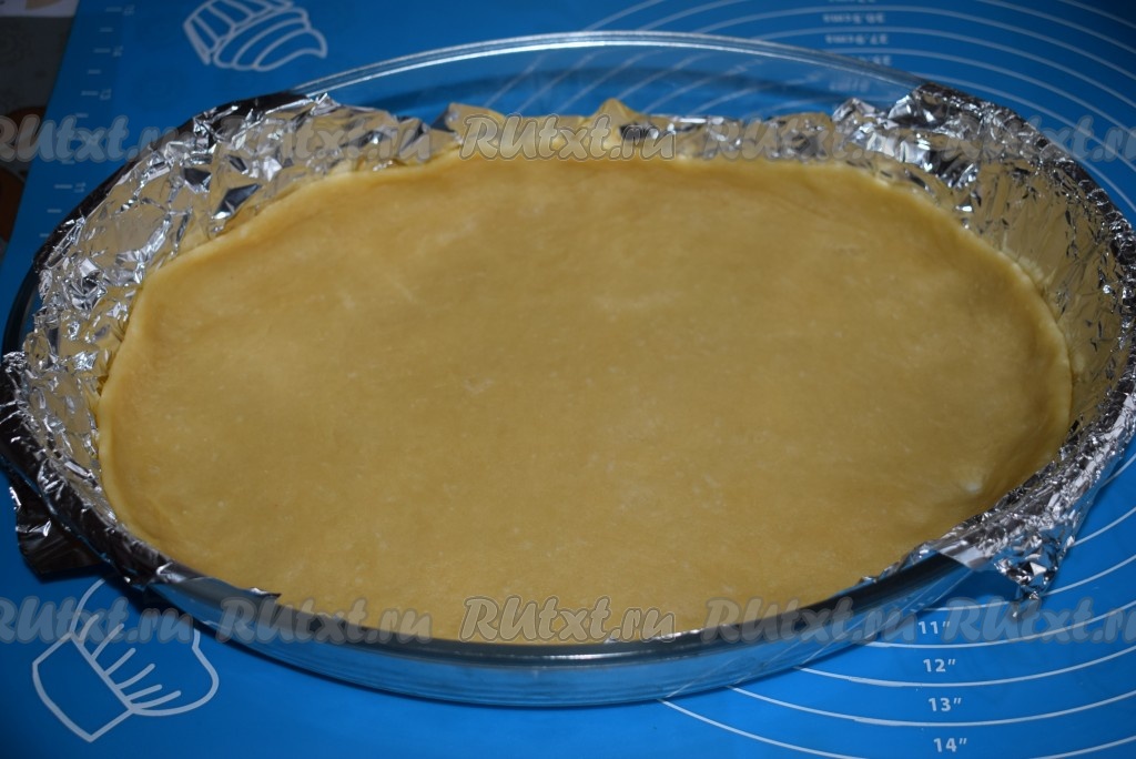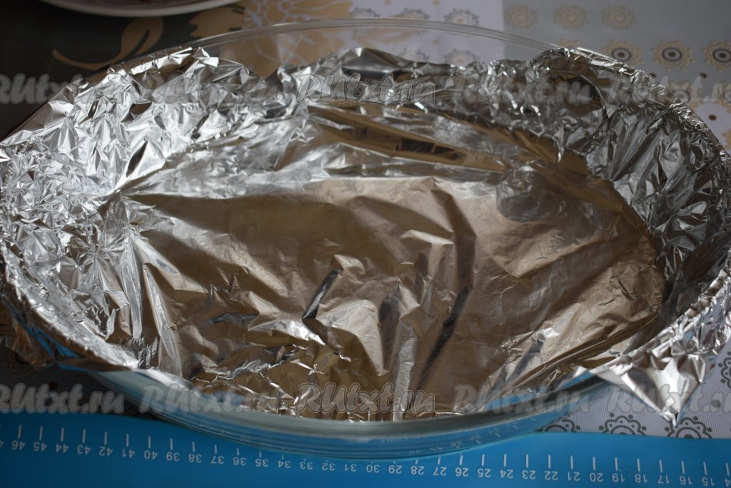 Форму, в которой будем печь пирог, застилаем фольгой (или пергаментом). Я выпекала в стеклянной овальной форме диаметром 24-26 см.