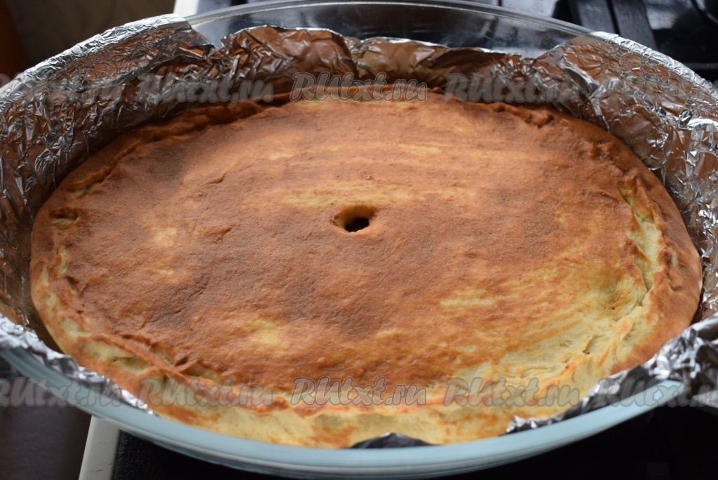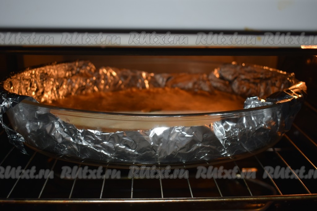 Далее отправляем пирог в разогретую духовку. Я ставила пирог в холодную духовку, так как пекла его в стеклянной форме. Выпекаем пирог при температуре 180 градусов в течение 40-45 минут.