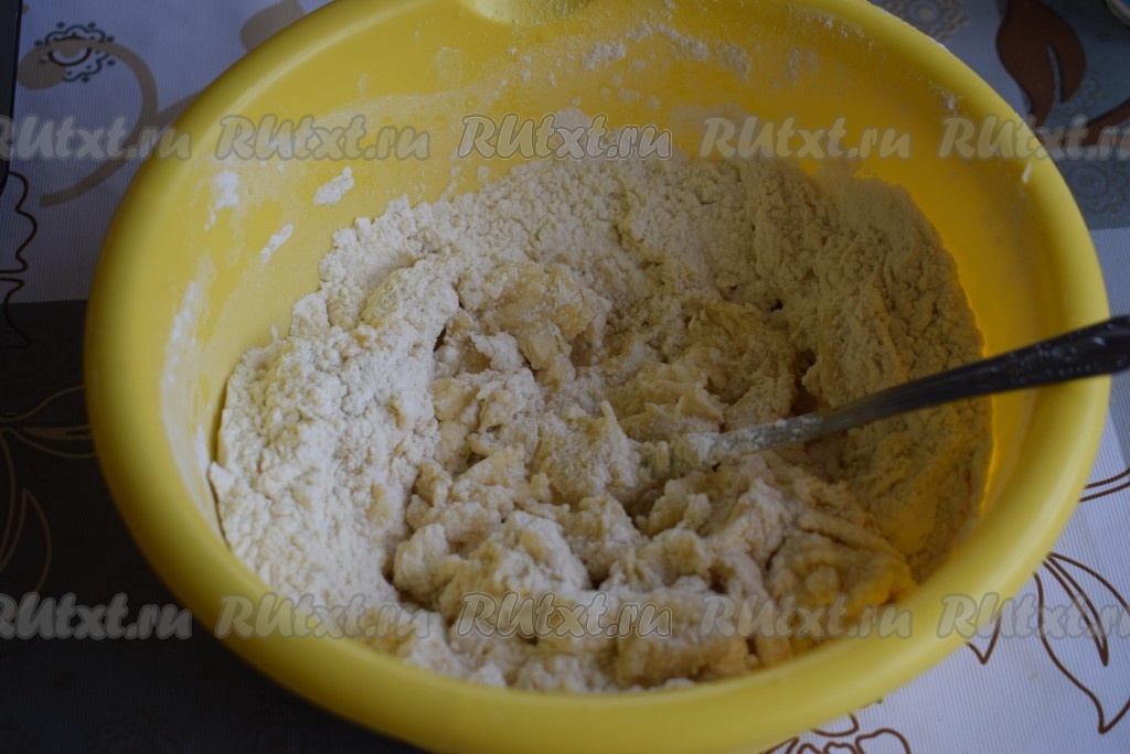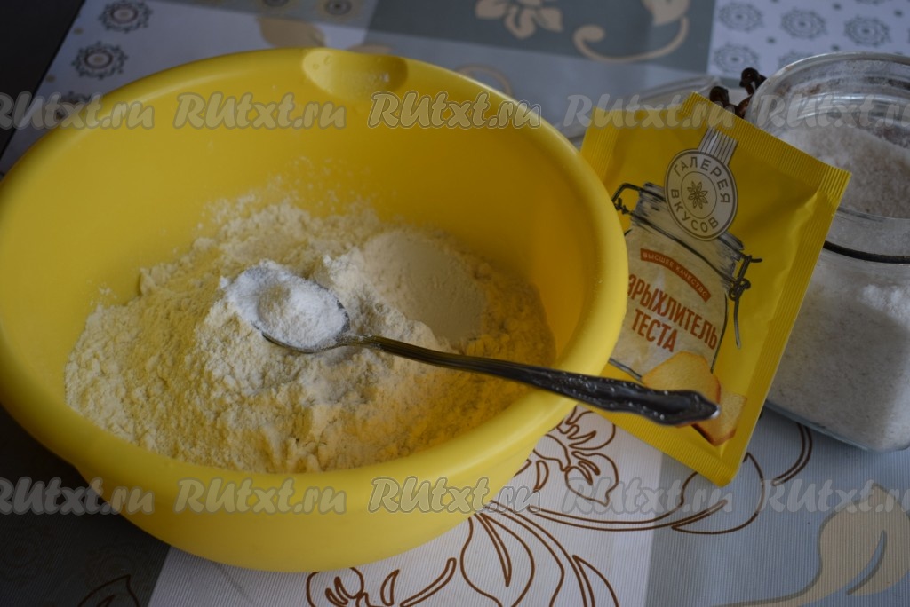 Теперь замесим тесто, для этого в миску насыпаем муку, добавляем соль, разрыхлитель и перемешиваем.