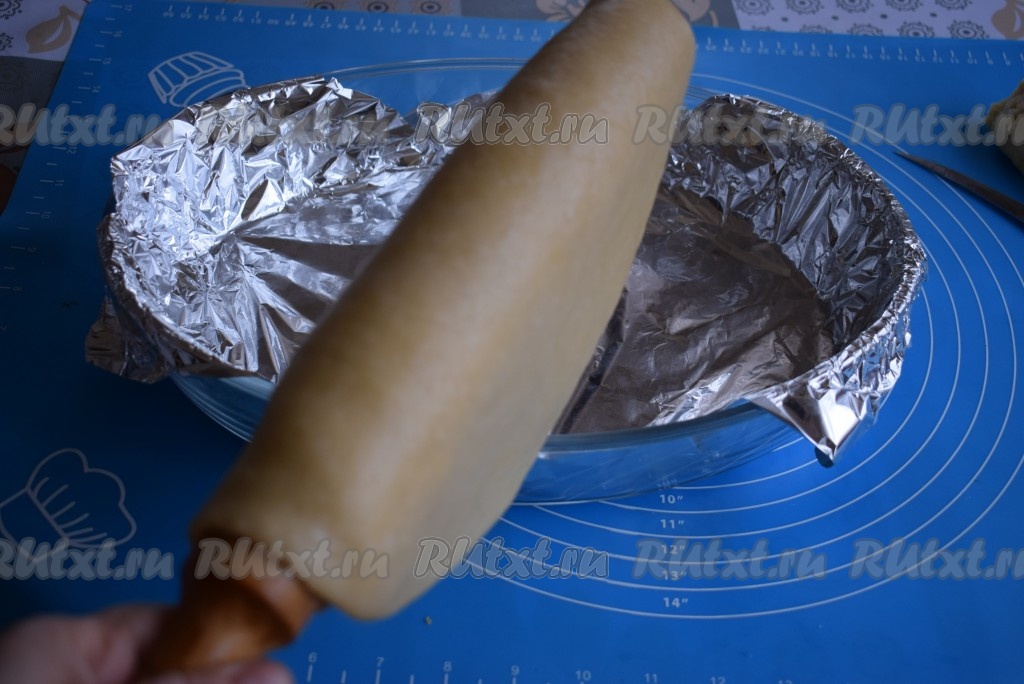 Накручиваем больший пласт теста на скалку и легко переносим его таким способом, выкладываем на дно формы.