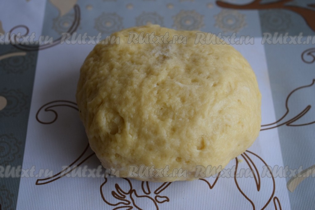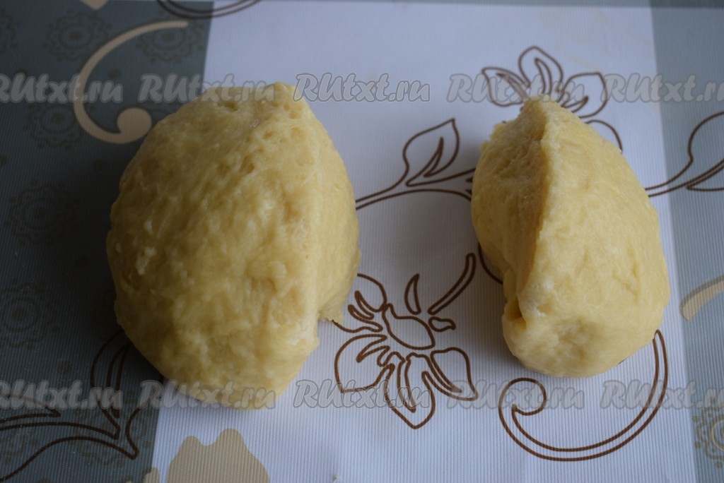 Далее ещё раз вымешиваем тесто, оно становится более гладким и очень податливым. Разделяем его на 2 кусочка: один большой (он станет основой пирога) и второй маленький (он станет верхней частью выпечки).