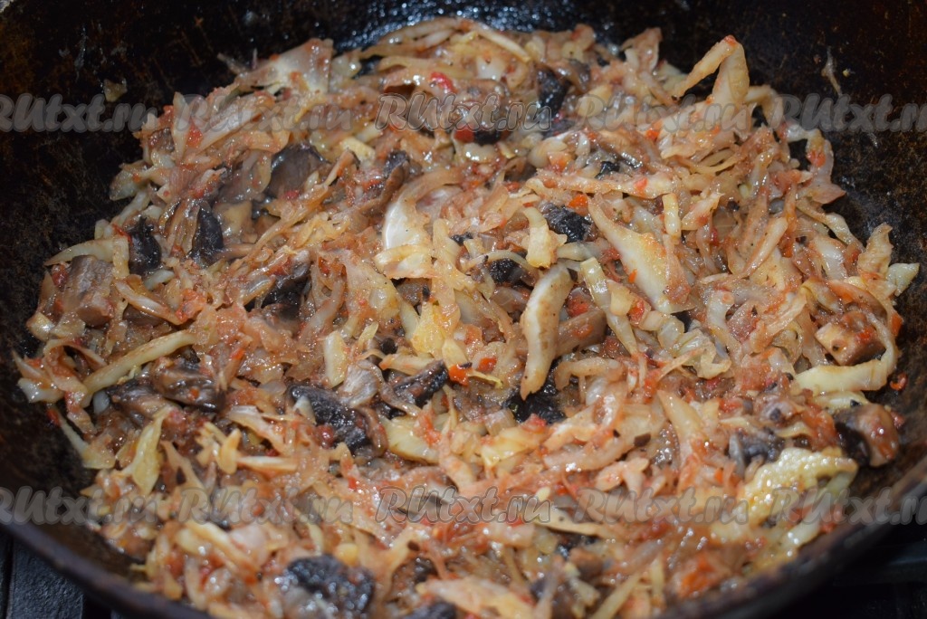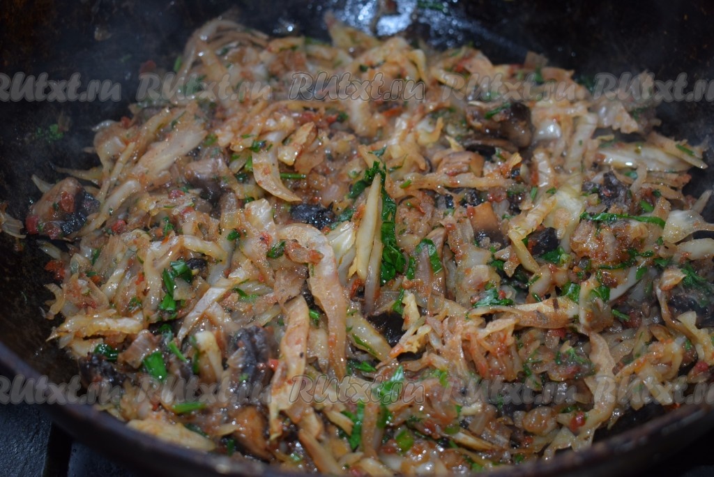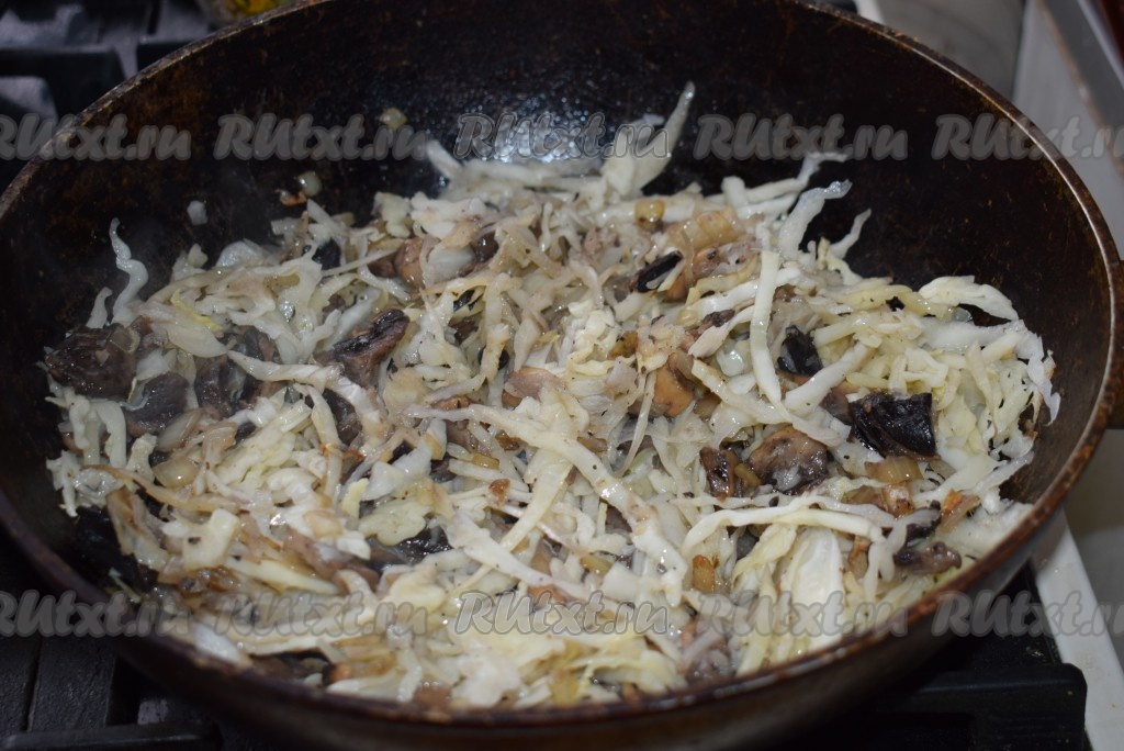 В сковороду добавим капусту и обжарим с грибами на среднем огне в течение 10 минут, перемешивая время от времени.