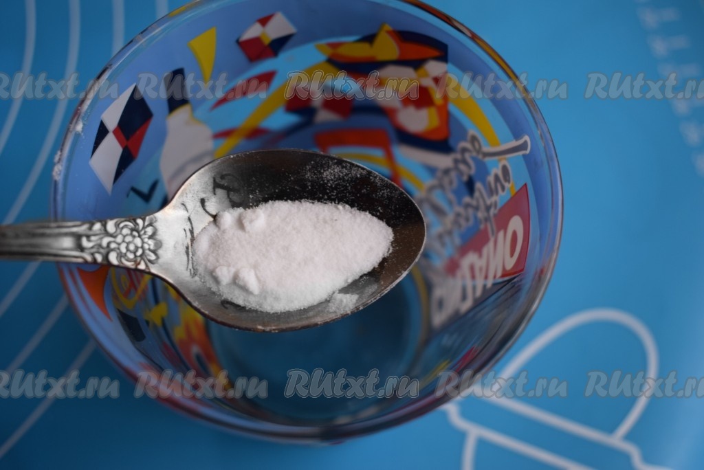 Далее приготовим содовую смесь для смазки пирога. Эта смесь придаст румяный, красивый цвет готовой выпечке. В кружку кладём соду и разбавляем её водой. В готовом пироге сода совсем не ощущается. Это проверено мною лично, так как я категорически не переношу запах и вкус соды. Если бы сода чувствовалась, я бы не советовала так делать.