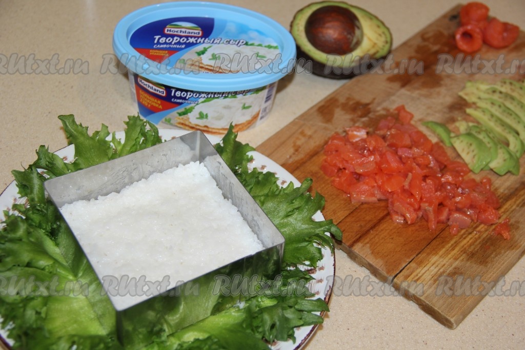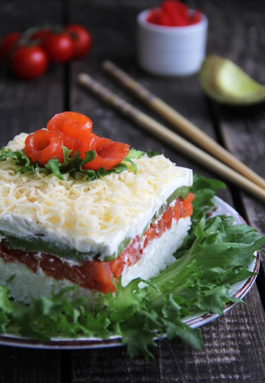 Предлагаю рецепт очень красивого и вкусного салата "Суши" с красной рыбой и авокадо. Блюдо получается нежнейшим. Выкладывается салат слоями и выглядит очень эффектно, а приготовить его совсем несложно. Я сформировала его в форме для салатов размером 12 см на 12 см - это на 4 порции. Блюдо станет прекрасной альтернативой суши, его можно нарезать на кубики и полить соевым соусом при подаче. Приготовьте этот салат к праздничному столу и насладитесь его интересным вкусом!