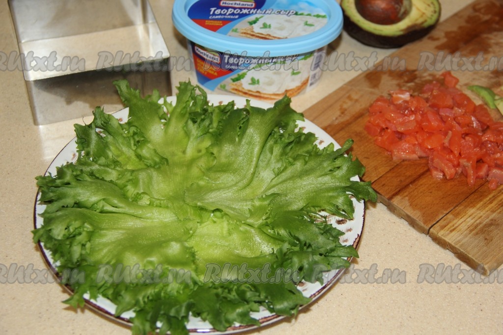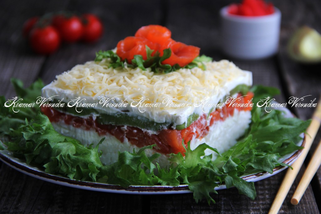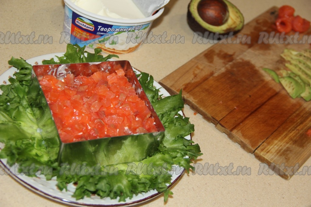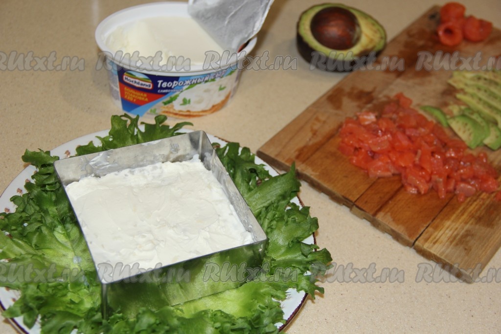 Следующим слоем выложить равномерно нарезанную красную рыбу и разровнять. Я оставила немного рыбы для украшения верхушки салата. Смазать рыбный слой творожным сыром.