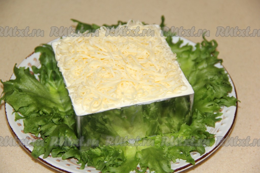 Верх салата украсить натёртым твёрдым сыром. Аккуратно снять бортики формы.