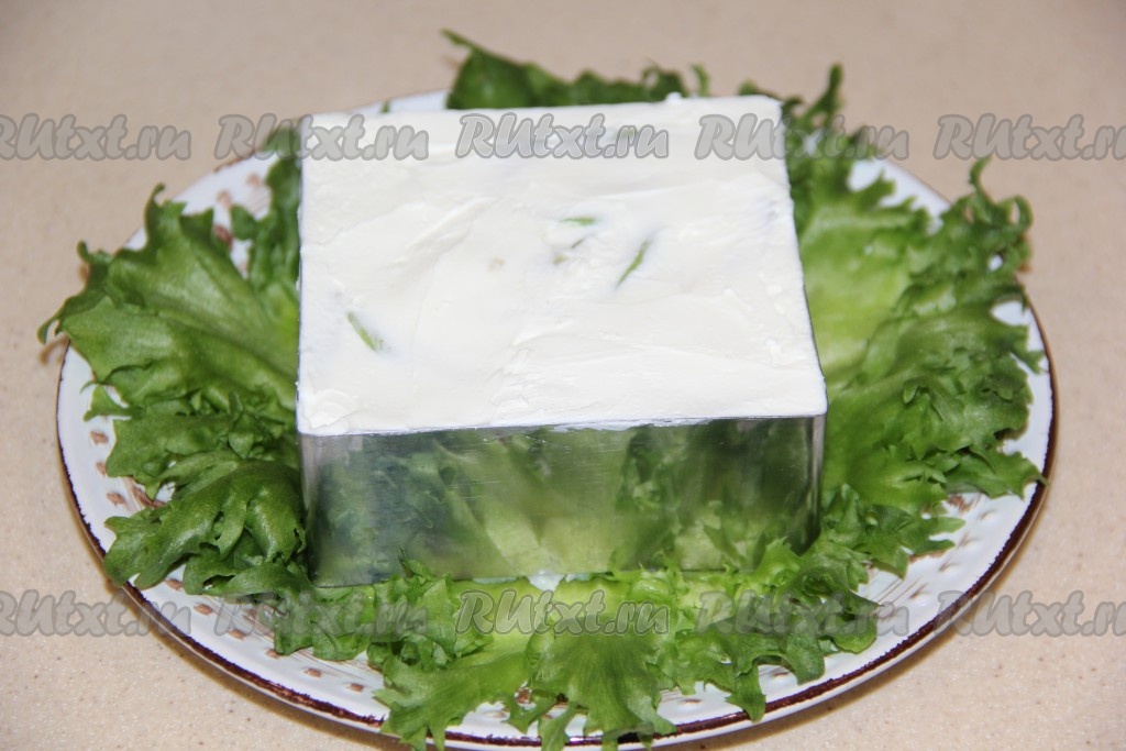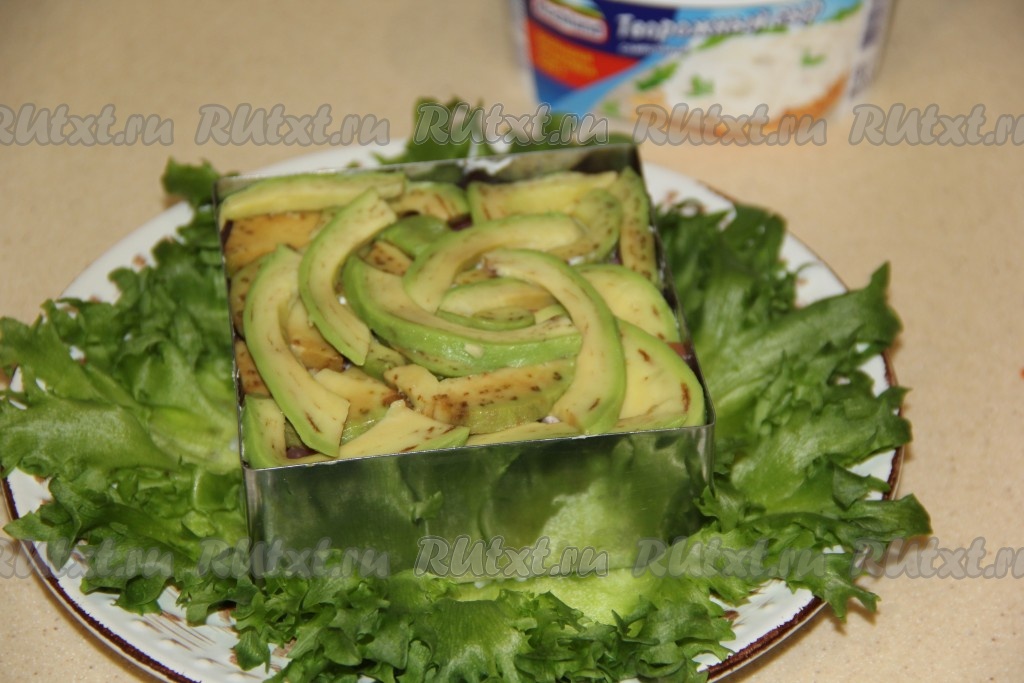 Поверх авокадо сделать ещё один слой творожного сыра и слегка утрамбовать салат.