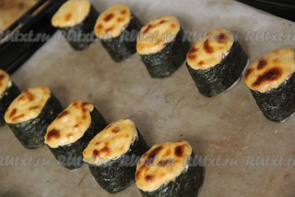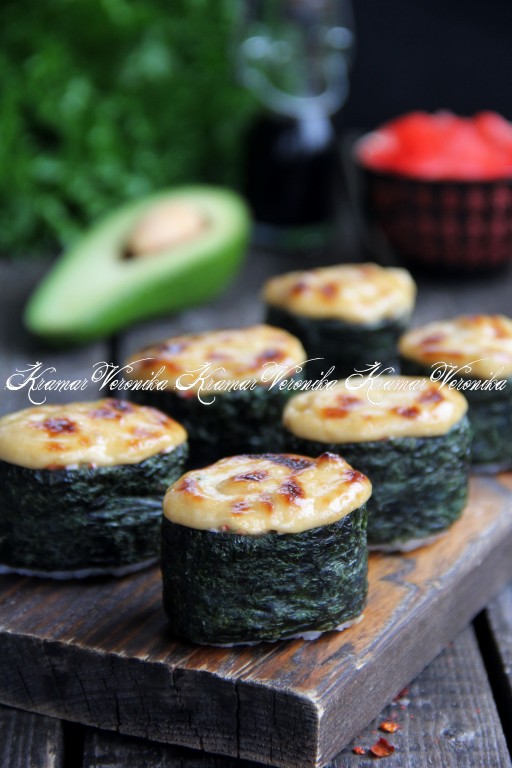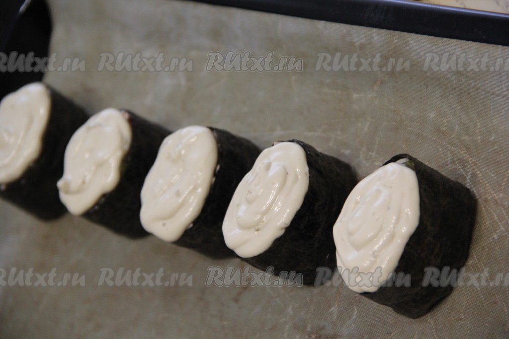 Обернуть каждый комочек риса подготовленной полоской из листа нори, край полоски нори слегка смочить и приклеить к другому краю листа. У нас должны получиться вот такие заготовки (как на фото) - лодочки с бортиком. Переложить заготовки на противень, застеленный пергаментом.