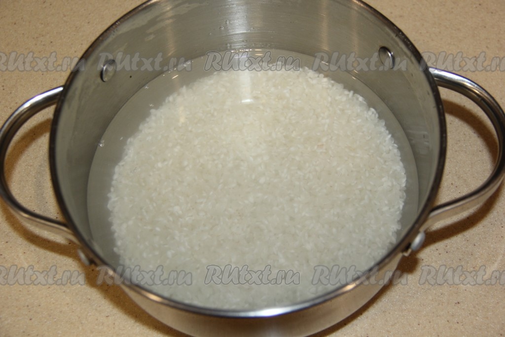 Рис для суши хорошо промыть, дождаться, чтобы стекла лишняя жидкость, переложить в кастрюлю, залить чистой холодной водой из расчёта 1:2 (то есть 250 грамм риса нужно будет залить 500 мл воды), оставить на 30 минут. За это время рис побелеет.