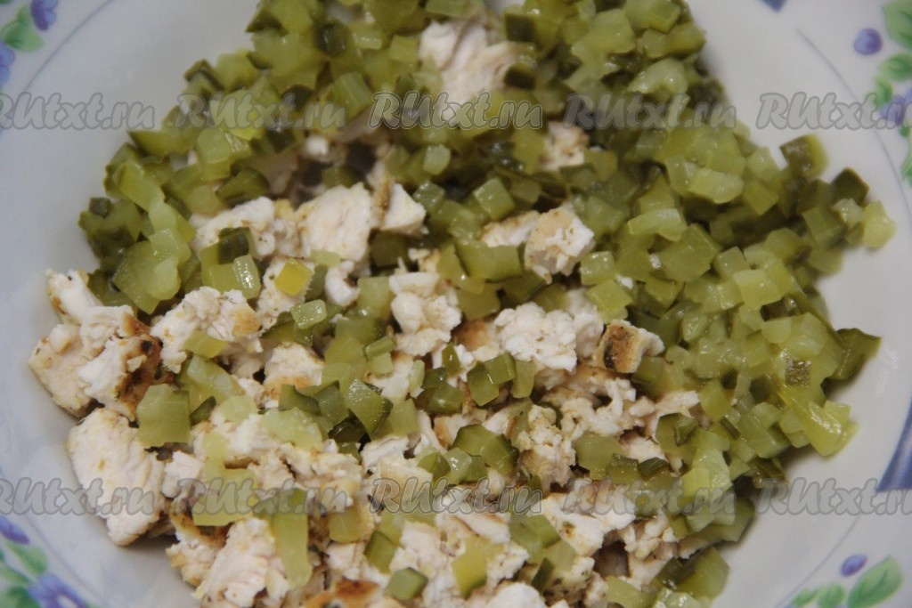 Готовое куриное филе и огурцы нарезать на мелкие кубики, соединить и перемешать.