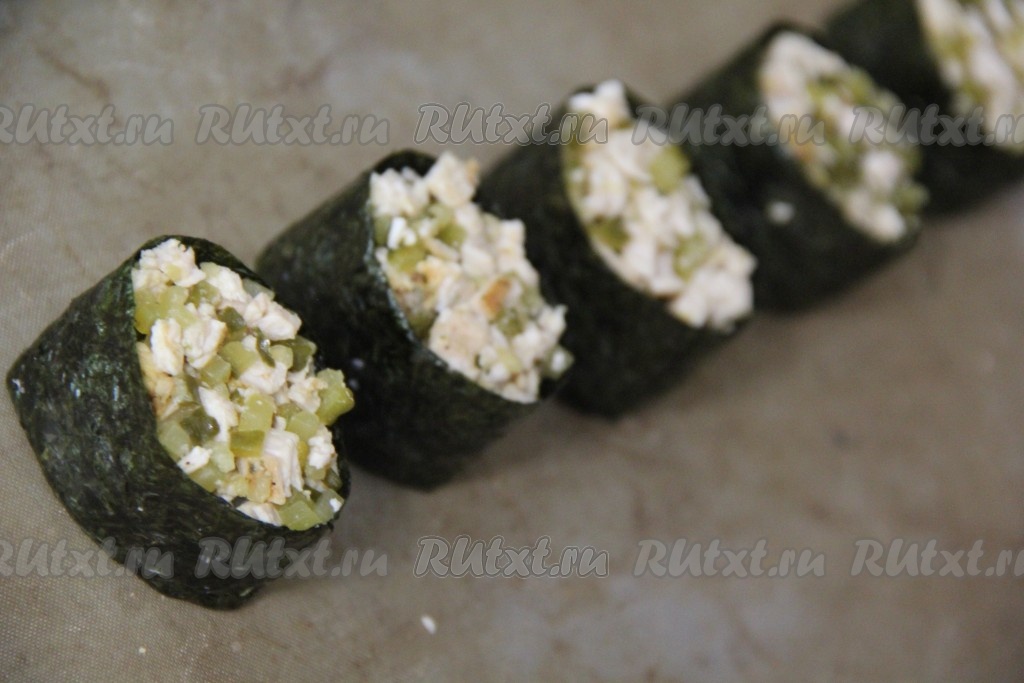Выложить поверх риса начинку из огурца и курицы.