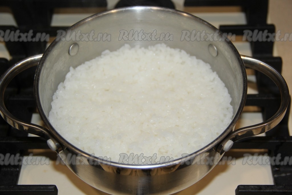Затем поставить кастрюлю на огонь и довести воду с рисом до кипения, после этого убавить огонь до минимума. Накрыть кастрюлю крышкой. Варить рис на самом медленном огне до полного испарения воды (около 15-20 минут). Затем убрать кастрюлю с рисом с огня. Накрыть кастрюлю полотенцем и полностью рис остудить.