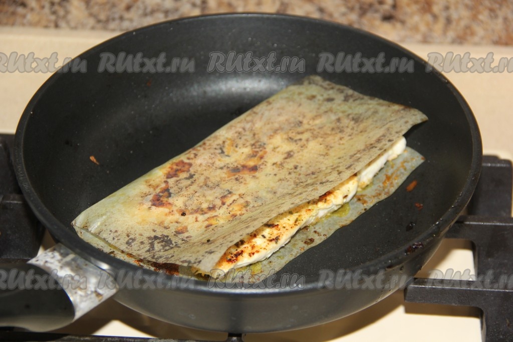 Обжарить филе в листе на сухой сковороде на среднем огне с двух сторон до лёгкой золотистой корочки.