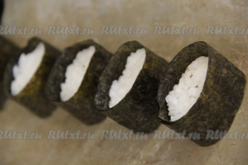 Затем мясо полностью остудить. Из риса сформировать комочки овальной формы, я взвешивала рис и делала заготовки по 30 грамм. Чтобы рис не прилипал, лучше смочить руки водой. Листы нори нарезать на полоски шириной 3-4 см.