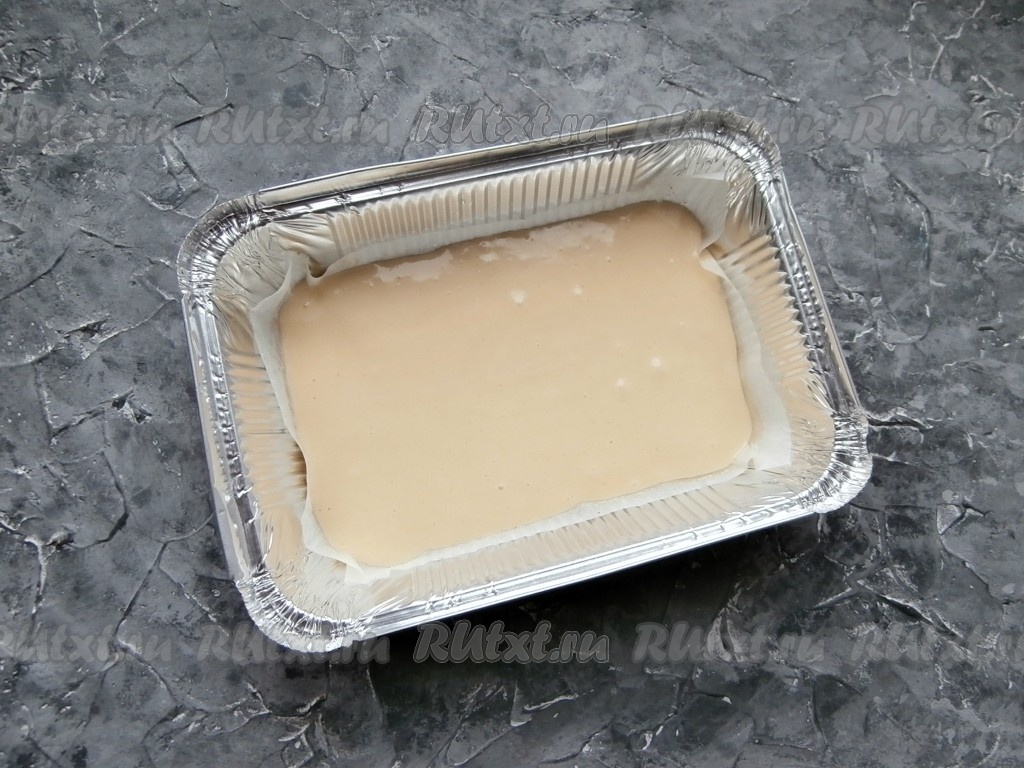 Форму (у меня размер - 22 см х 15 см) застелить пергаментом, смазать немного маслом. Вылить половину теста.