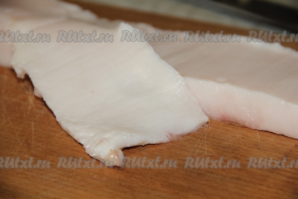 Свежее сало аккуратно нарезаем тонкими пластинами.