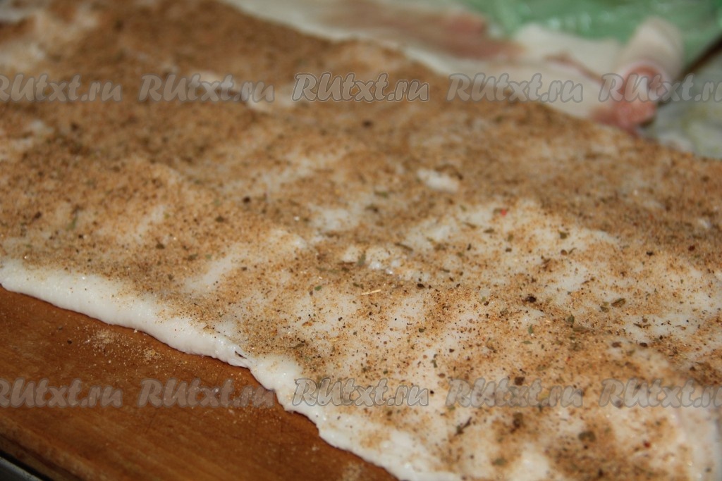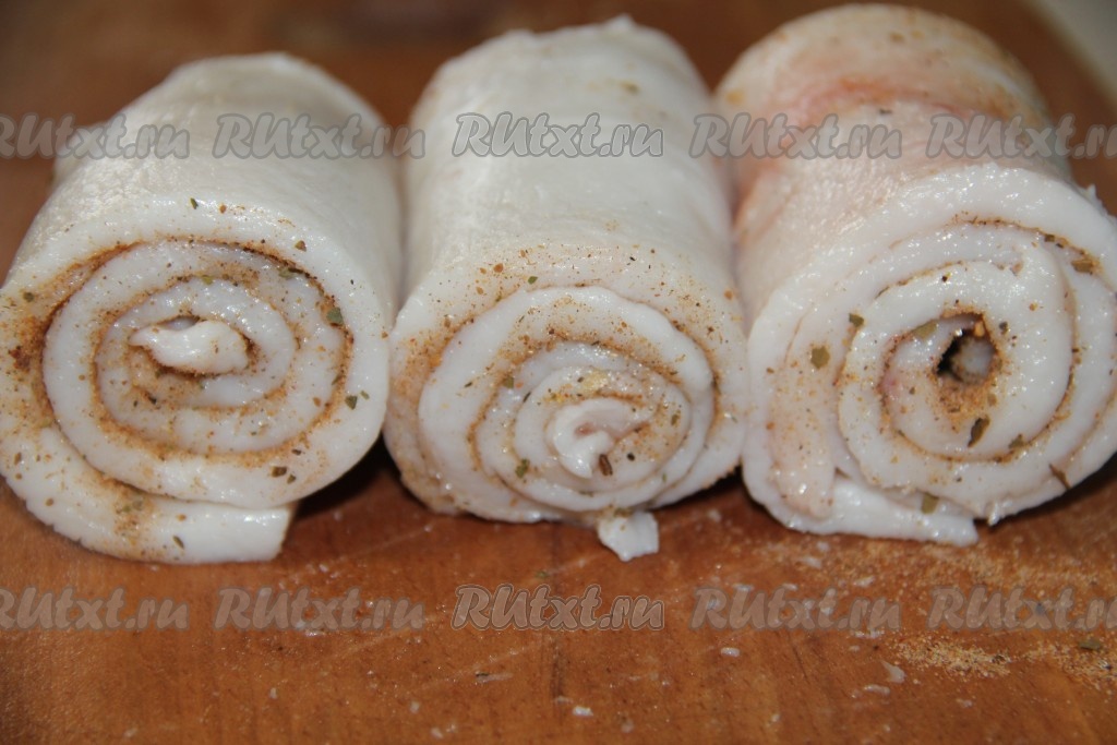 Скручиваем каждую пластину из свиного сала в отдельный рулет.