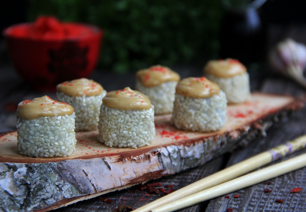 Роллы, запечённые с крабовыми палочками, приготовить не так уж и сложно. Предлагаю сделать роллы рисом наружу и запечь их под спайси соусом. Такие роллы получаются очень вкусными, красивыми и пикантными. При подаче их можно дополнить соевым соусом и маринованным имбирём.