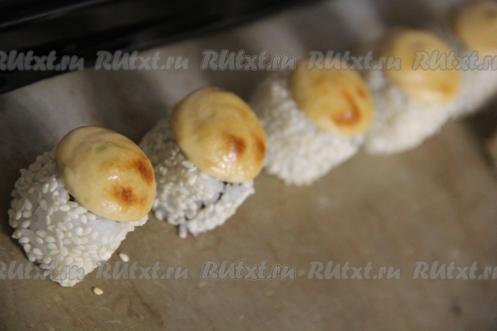 Запекать роллы с крабовыми палочками в разогретой духовке при температуре 200 градусов (если духовка позволяет, выставить режим "Верхний нагрев"), примерно, 3-4 минуты.