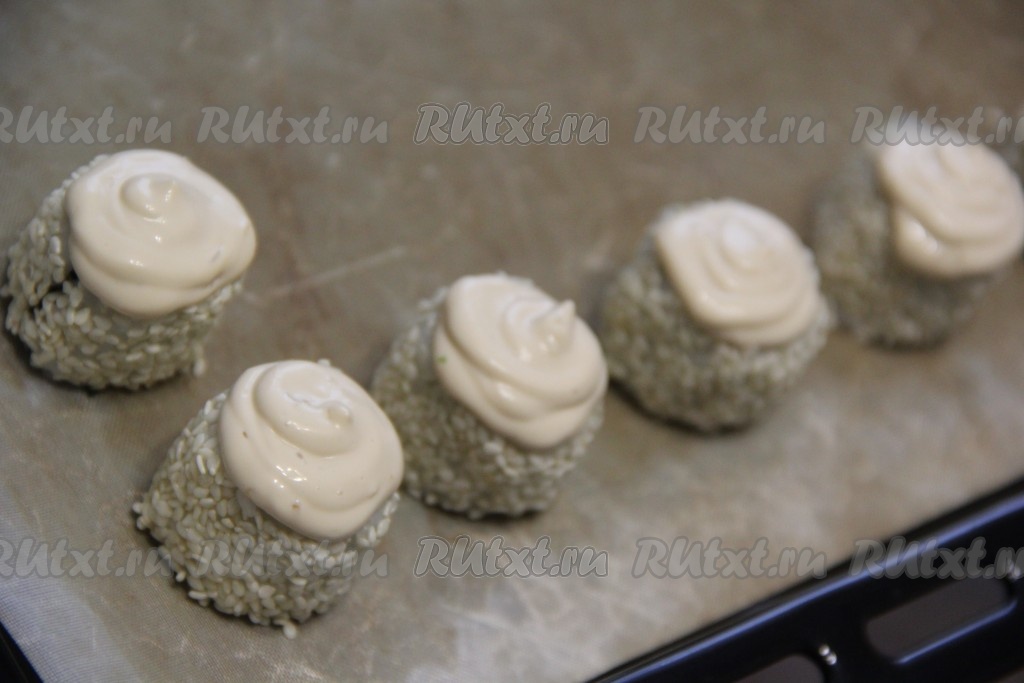 Нарезать ролл на 5-6 кусочков. Поставить нарезанные роллы срезом вниз на застеленный пергаментом (или тефлоновым ковриком) противень. Выложить соус поверх роллов.