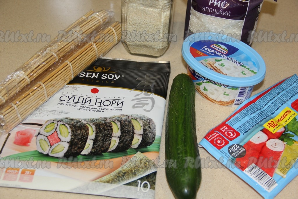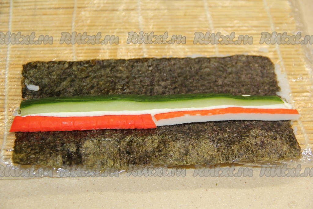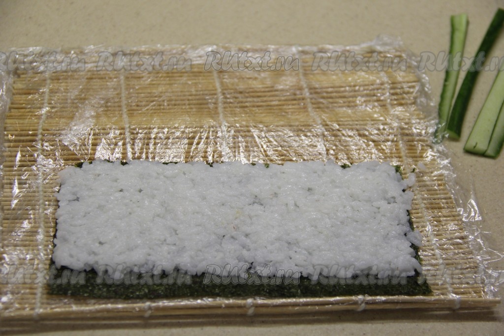 Лист нори разрезать на две части вдоль. На циновку, застеленную пищевой плёнкой, поместить нори блестящей стороной вниз. Выложить на нори часть остывшего риса и разровнять по листу нори, оставив 1 см с одного длинного края листа пустым. Чтобы рис не прилипал к рукам, можно смочить руки водой.