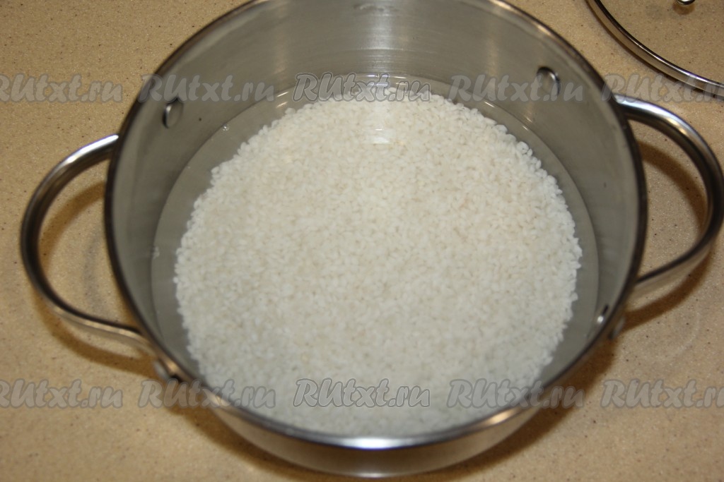 Рис хорошо промыть, а после этого переложить в кастрюлю и залить холодной водой (для варки 100 грамм риса нужно влить 200 мл воды). Оставить рис на 30 минут.