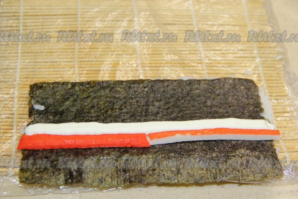 Перевернуть лист нори рисом вниз. Выложить брусочки крабовых палочек.