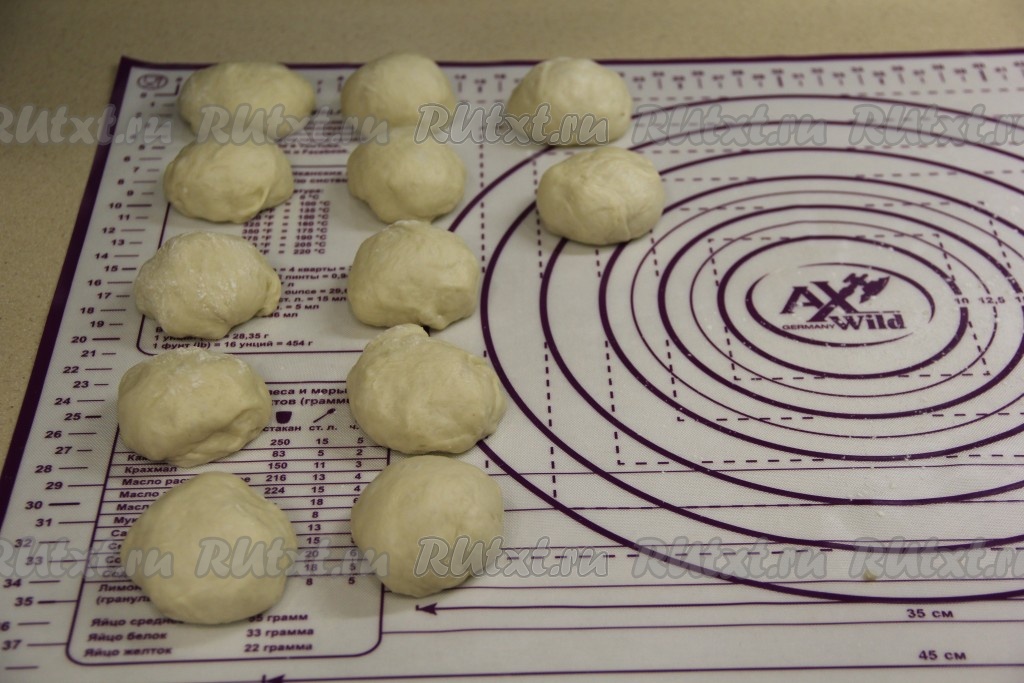 Подошедшее тесто слегка обмять и разделить на 12-13 частей. Сформировать из частей теста 12-13 колобков.