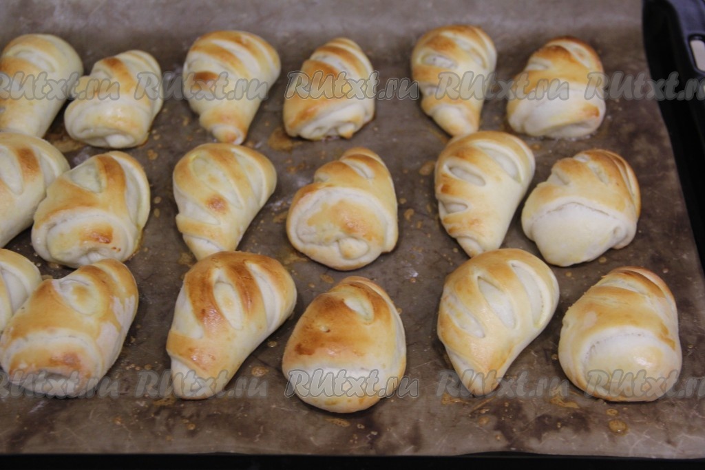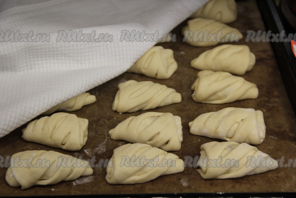 Выложить сформированные пирожки на небольшом расстоянии друг от друга (всего получится 24-26 штук) на противень, застеленный тефлоновым ковриком (или бумагой для выпечки), накрыть полотенцем и оставить на расстойку на 30 минут.