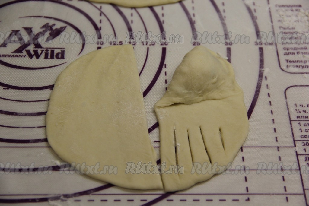 Каждый колобок на присыпанной мукой поверхности раскатать в круг не очень тонко. Каждый раскатанный круг разрезать на 2 части.