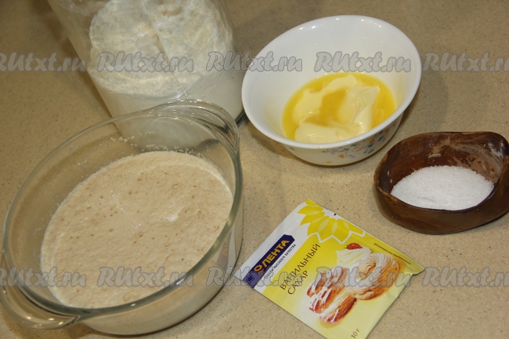 Когда дрожжевая смесь запенится, перелить её в глубокую миску, добавить растопленное масло, всыпать муку, соль и ванильный сахар.
