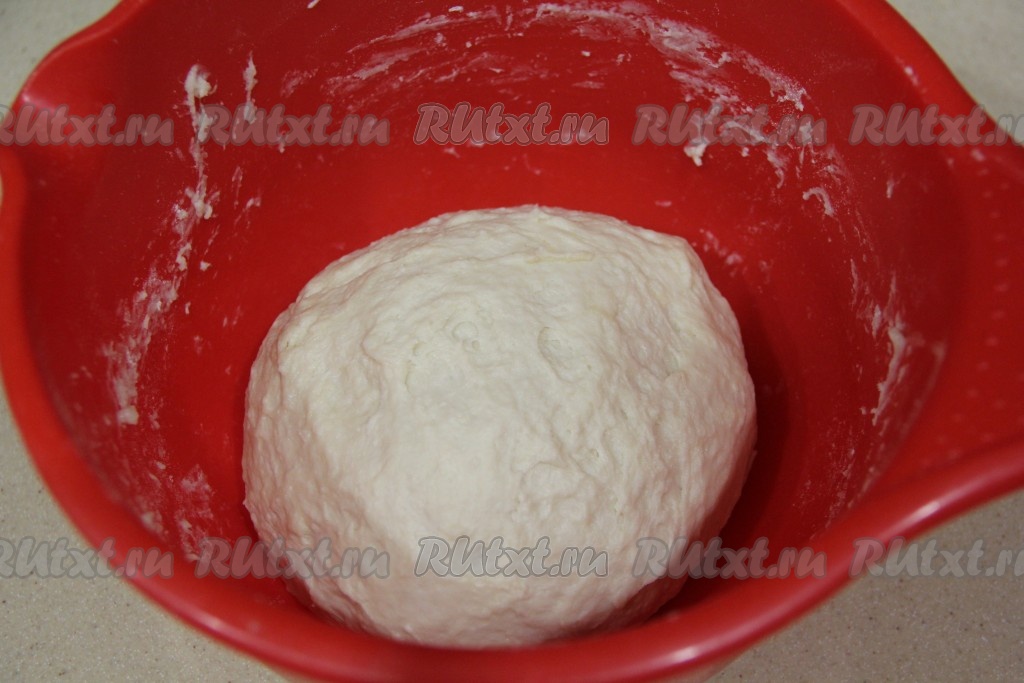 Замесить вначале ложкой, а затем как следует вымесить руками дрожжевое тесто, которое должно получиться нежным и мягким. Тесто оставить в миске, накрыть полотенцем, чтобы оно не заветрилось, и поставить на 1 час в тёплое место (до увеличения в объёме в 2-3 раза).