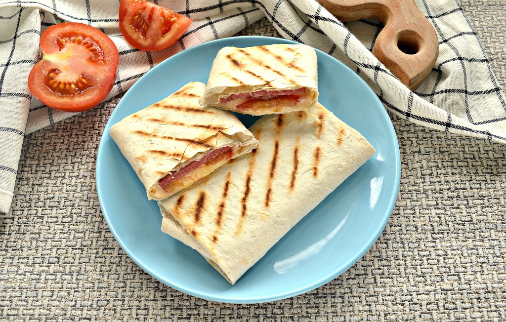 Вкусные, аппетитные горячие бутерброды из лаваша с колбасой, помидорами и сыром готовы, перекладываем их со сковороды на тарелку и сразу подаём к столу к чаю или кофе.