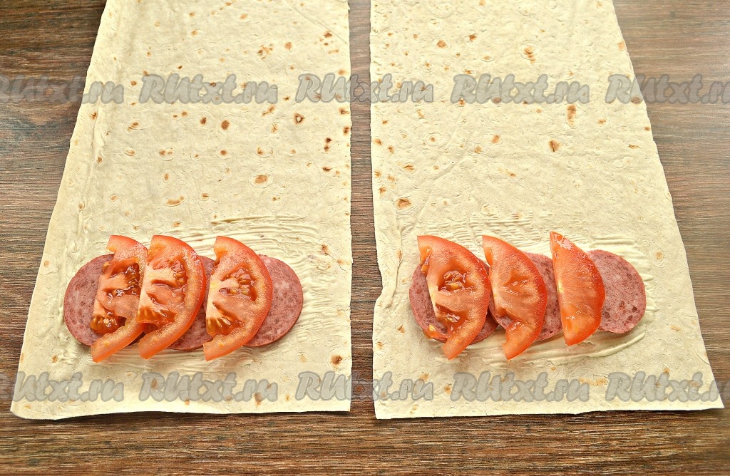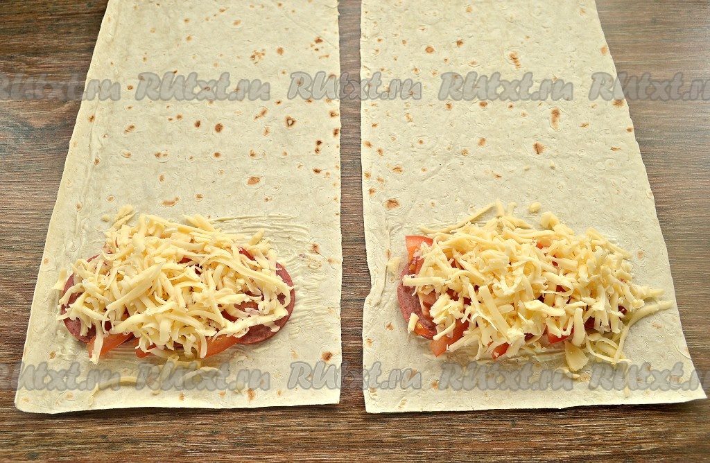 Начиная со стороны, на которую выложена начинка, аккуратно свернуть лаваш в форме конверта, подогнув края внутрь. У нас получатся 2 бутерброда из лаваша с колбасой, помидорами и сыром.