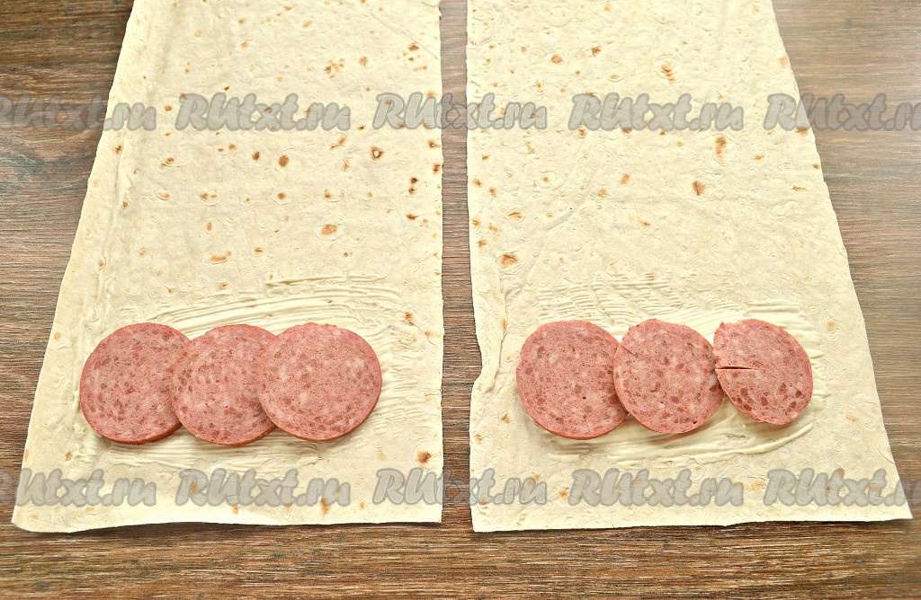 На смазанную майонезом часть лаваша выложить ломтики колбасы. Я использовала копчёную колбасу, но можно взять любую на ваш вкус.