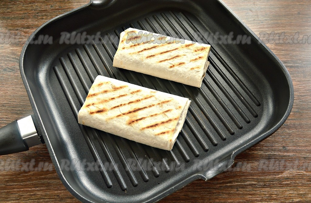 Обжарить бутерброды из лаваша на разогретой сухой сковороде (я использовал сковороду гриль) с двух сторон до румяности (на обжаривание в общей сложности потребуется около 1-2 минут).