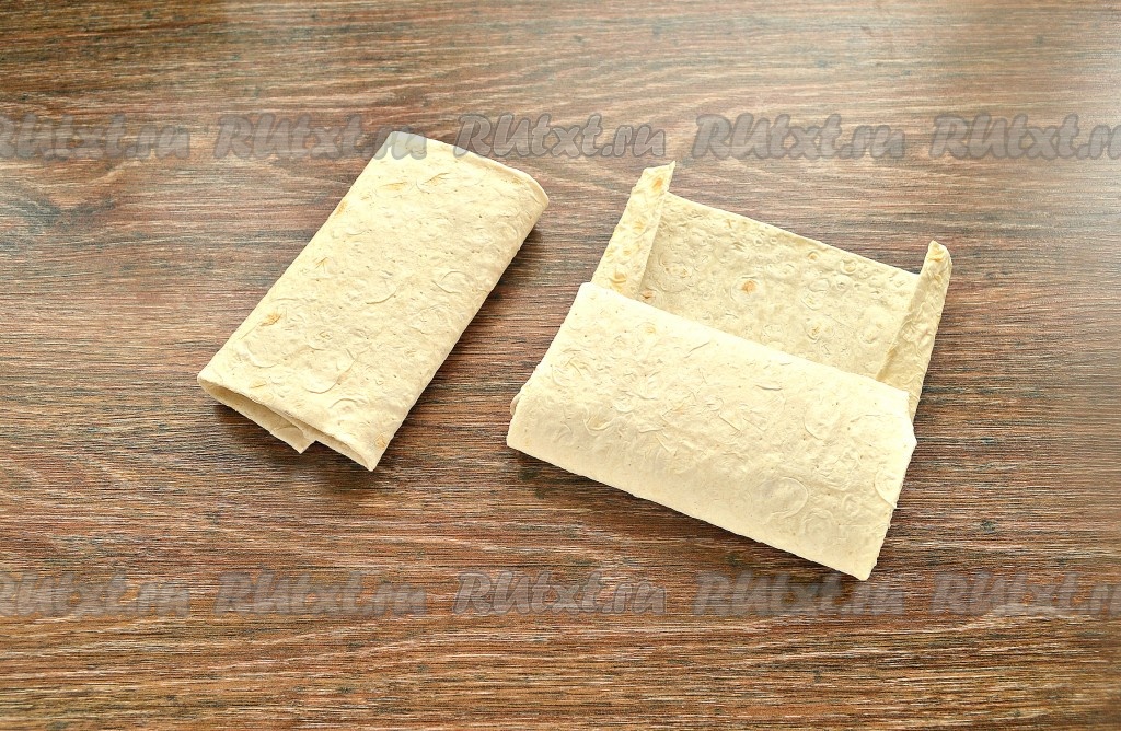 Кулинарными ножницами разрезать тонкий лаваш на две равные половинки.