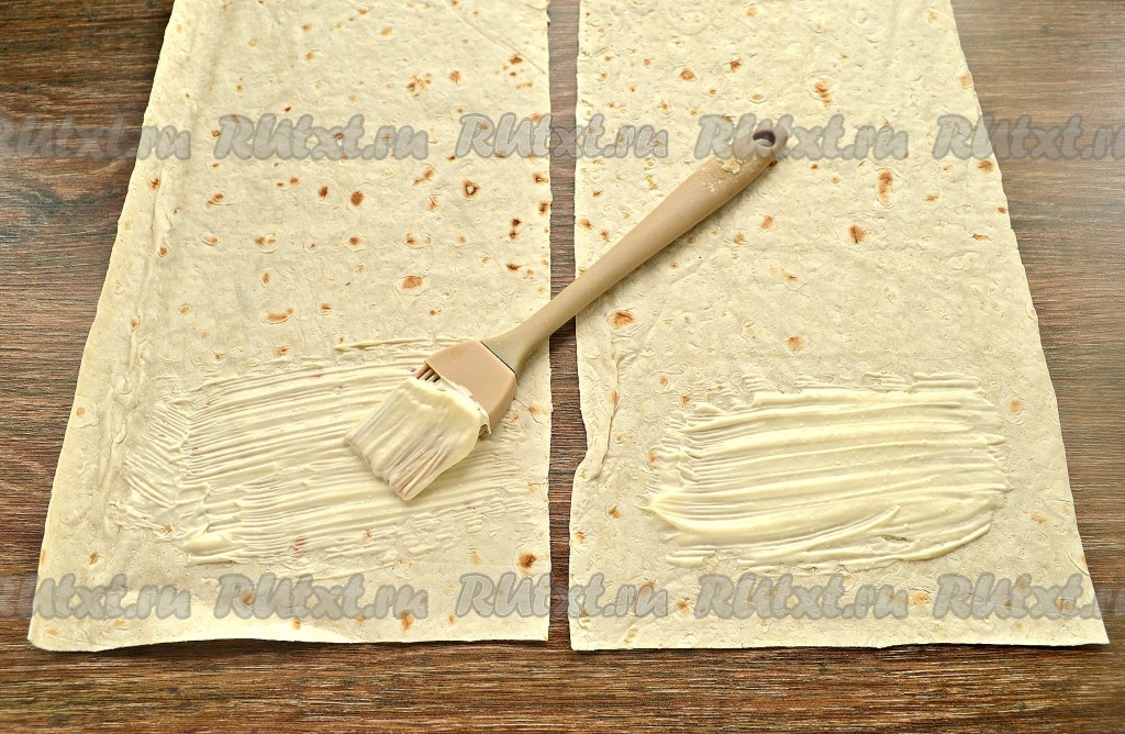 Одну сторону заготовок (приблизительно, 1/4 часть) смазать майонезом, оставляя чистыми края, как на фото.