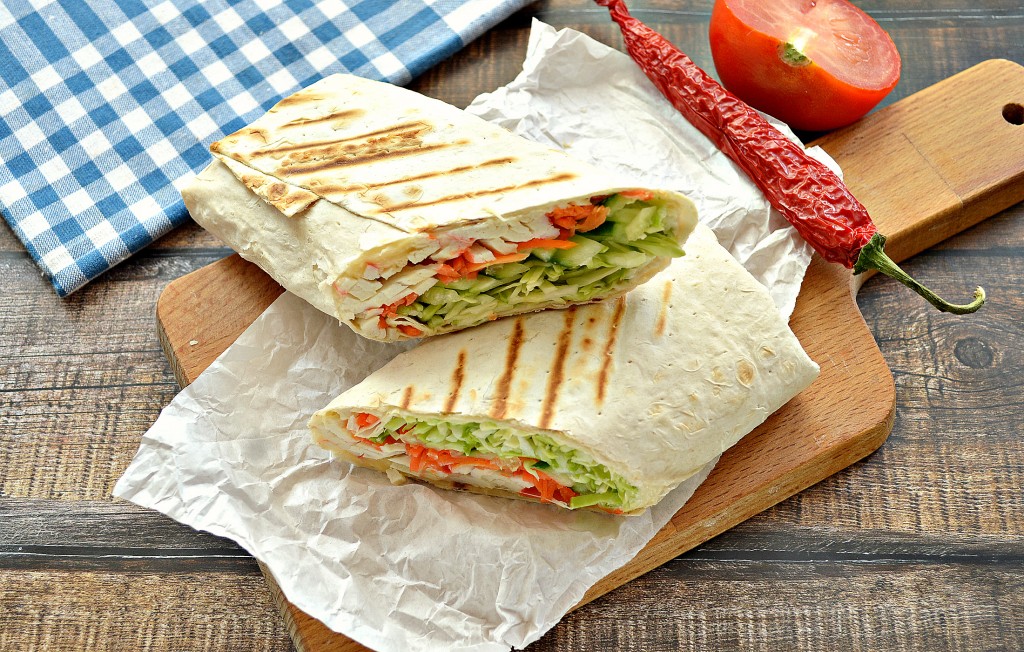Сытно перекусить вкусной шаурмой - это, наверное, самый простой и быстрый способ утолить голод. Если вы обходите стороной ларьки, предлагающие шаурму, то приготовьте её самостоятельно в домашних условиях. Популярностью пользуется шаурма с курицей или свининой, а у меня менее затратный вариант – шаурма с крабовыми палочками, огурцом, морковкой по-корейски, капустой и сыром. Получается такая шаурма сочной, сытной, аппетитной и очень вкусной, попробуйте!
